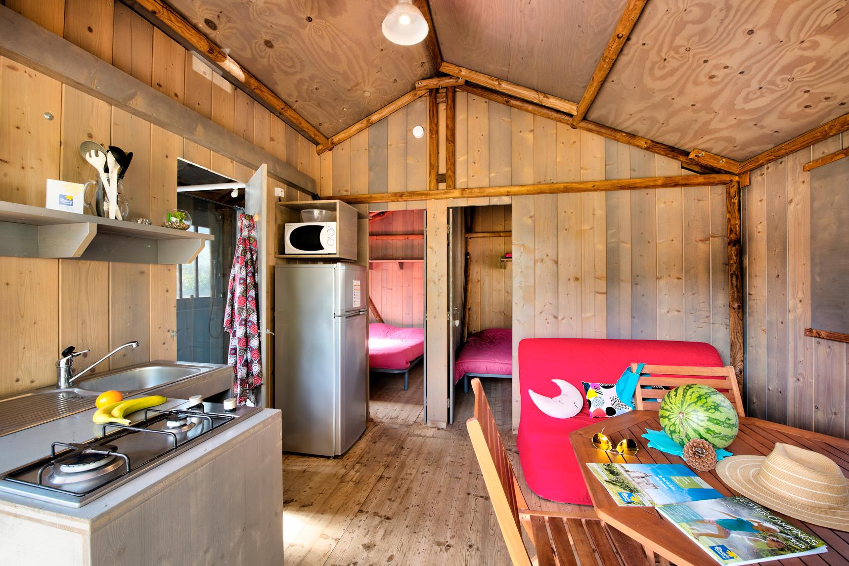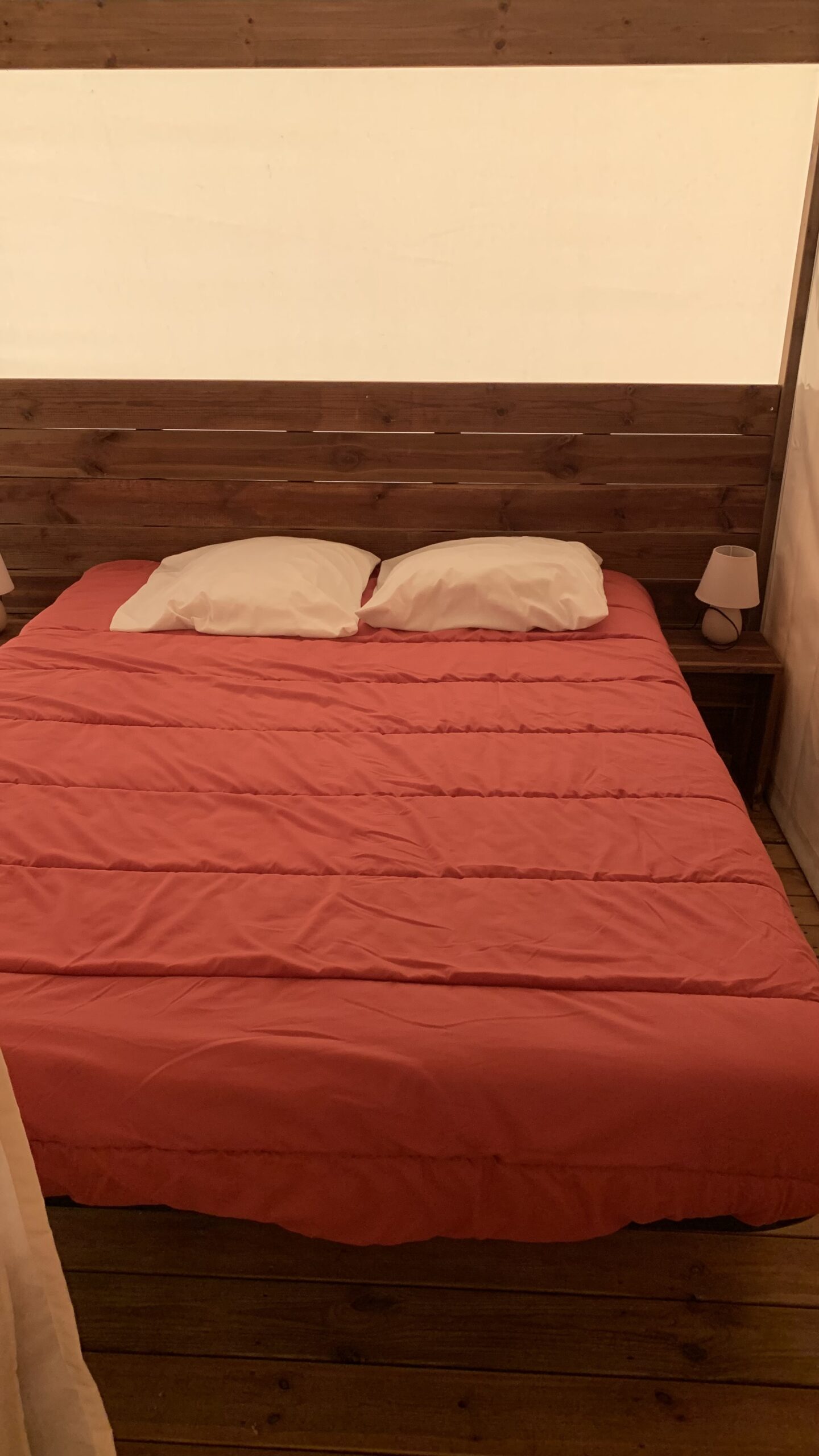 Notre cabane équipée de 34m2 (avec sanitaire) pour 4 personnes avec 2 chambres (2 lits simple 90 x 190 cm, 1 lit double 140 x 190 cm) saura vous séduire de par son confort, son décor atypique toilé et boisé ainsi que sa grande terrasse couverte.