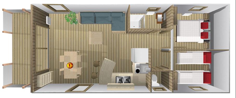 Envie de vacances avec un confort premium ? Notre spacieuse Cosyflower sur pilotis toute équipée de 38 m2 pour 4 personnes avec son grand séjour avec TV, ses 2 chambres (2 lits simples 90 x 190 cm, 1 lit double 160 x 200 cm) et de sa large terrasse de 11 m2 est la réponse à votre envie ! Vous vivrez un séjour surélevé qui vous procurera une expérience chic et insolite en camping.